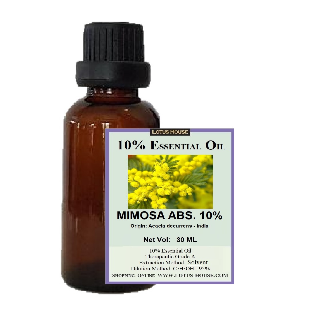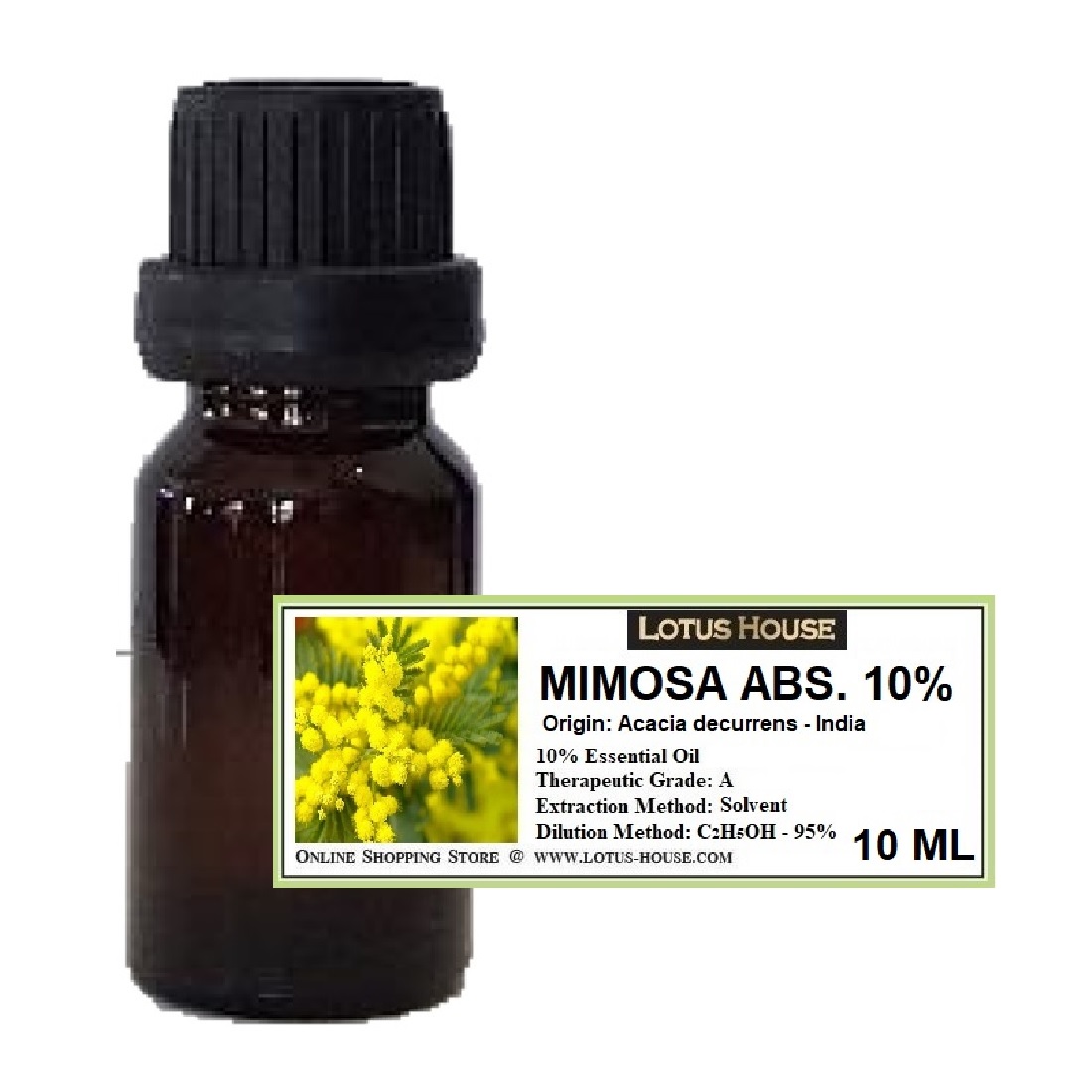 Mimosa absolute is solvent extracted from fresh flowers of the plant. The aroma is fresh, floral, powdery, soft and beautiful sweet honey-like heart note that is very popular in perfumery. The absolute is thick green solid so we dilute 10% of the pure absolute with 99.8% food grade ethanol for easily use. Mimosa absolute is excellent perfume ingredient for floral note and highly recommend as it's quite rarely find in the market. The absolute blend well with Lavender and especially Neroli. Recommend percentage is 0.05%-1.00% in the formula.